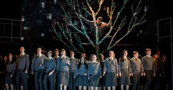 James Hall as Johann with Stuart Jackson as Pierre in the tree and the Glyndebourne Youth Chorus